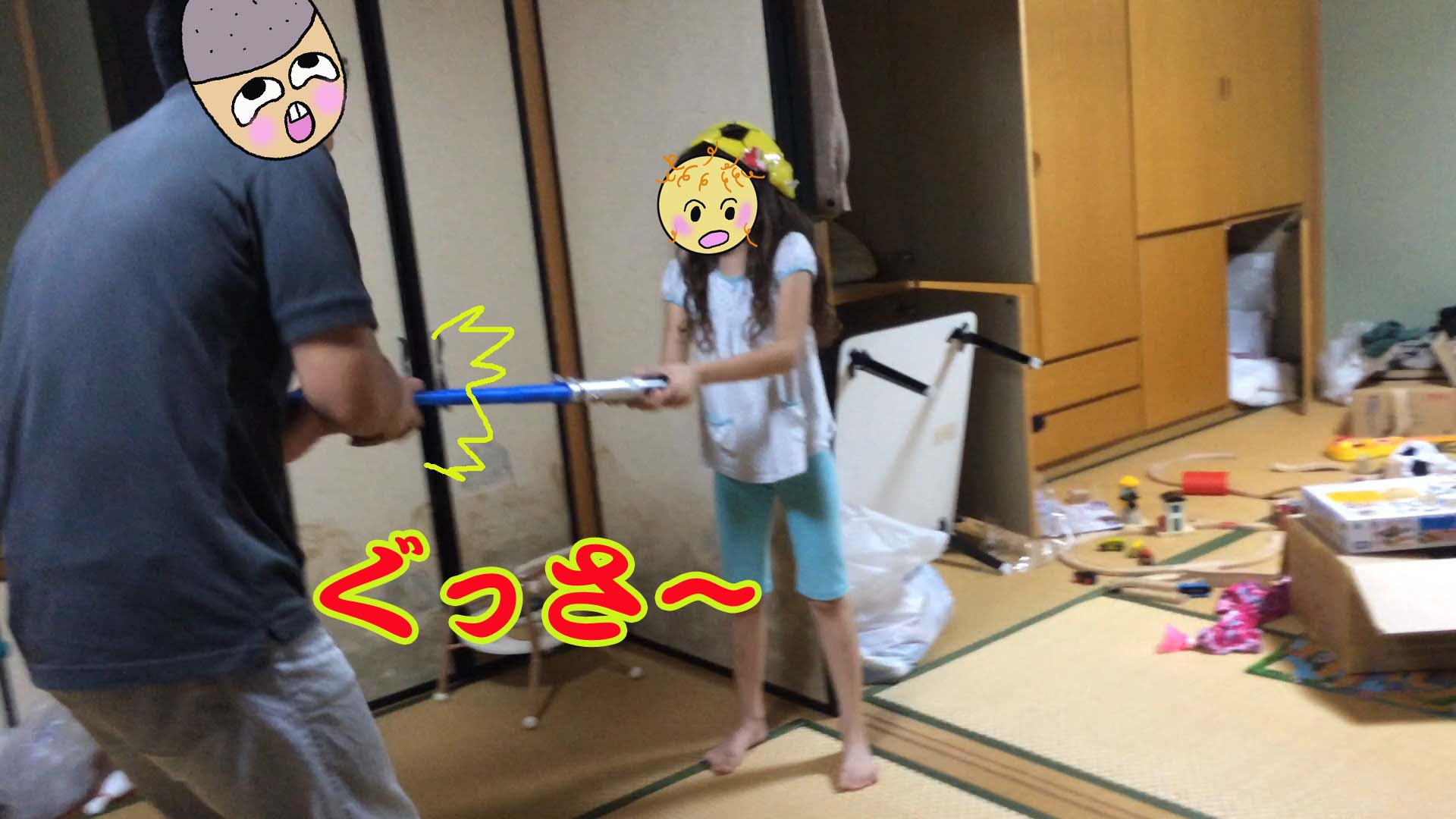 遊びはじめは楽しくて、ニコニコしながら子供らに斬って撃たれて殴られ?るが、